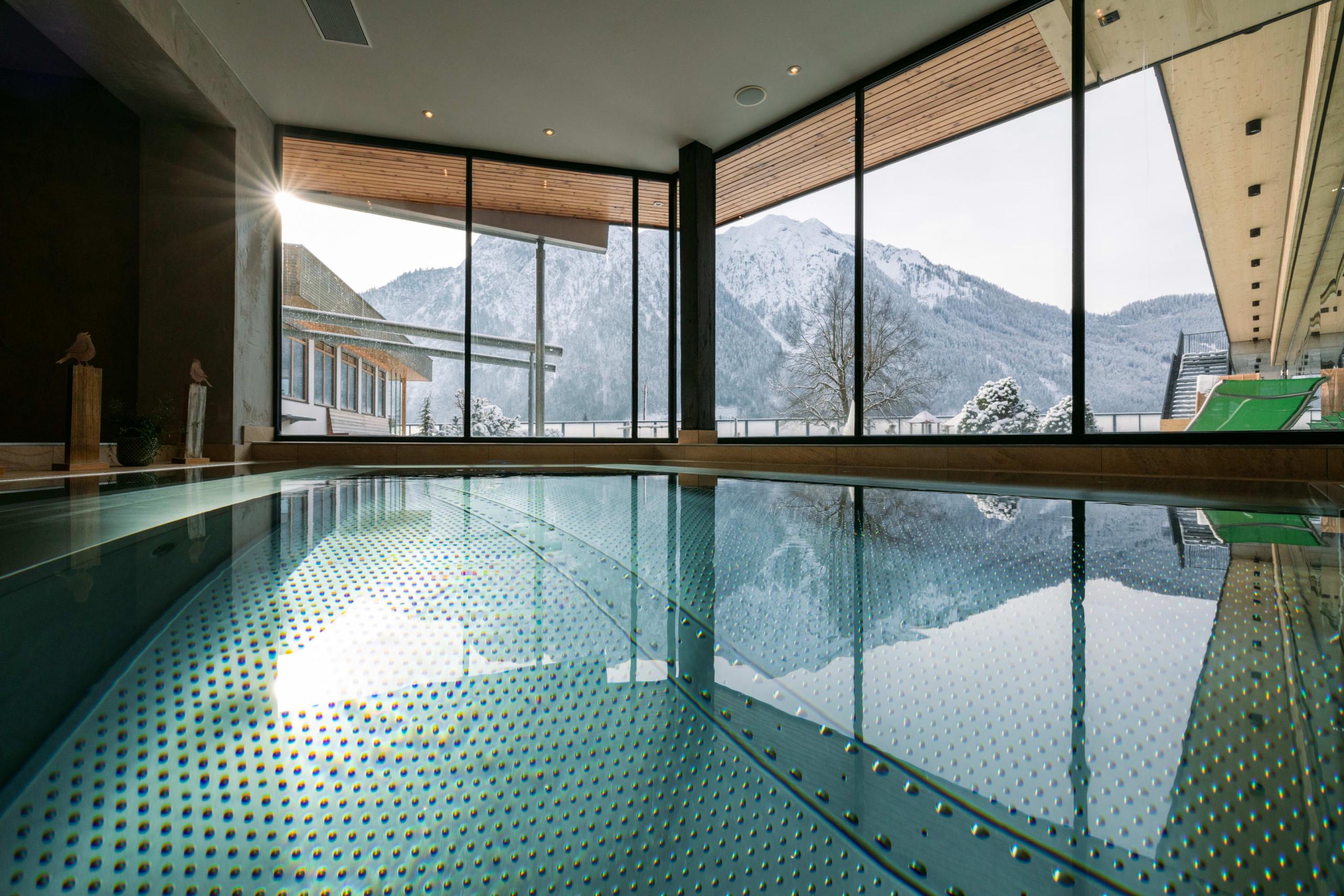 - Großzügig erweiterter Indoor Pool mit bequemen Relaxinseln und -Kojen, Zwergenpool, Whirlpool (35°C), Riesen-Reifenrutsche