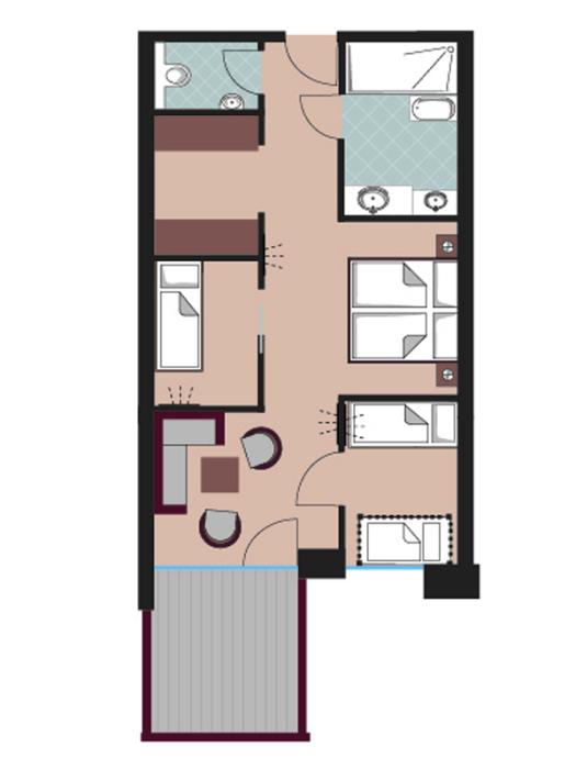 Other amenities: 1 bedroom, 2 children's rooms with single beds (190 x 90 cm) and 1 toddler bed (160 x 80 cm), sitting area, terrace, shower, baby bathtub, children's sink, separate toilet, hairdryer, cosmetic mirror, safe, flat-screen TV, telephone, Wi-Fi