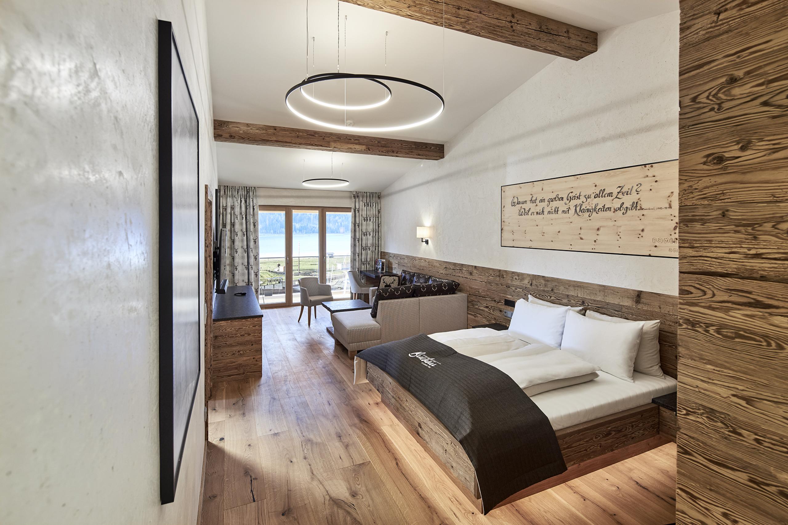 Other amenities: 1 master bedroom with living area and 1 children's room with toddler bed (160 x 60) and single bed (190 x 90) and 1 children's room with 2 single beds (190 x 90), South-facing balcony with lake view, oak flooring, refrigerator, shower and bathtub, children's washbasin, infrared cabin, hairdryer, cosmetic mirror, separate toilet, telephone, Wi-Fi, safe, 55'' smart TV with Netflix, Amazon TV, and Sky with soundbar.