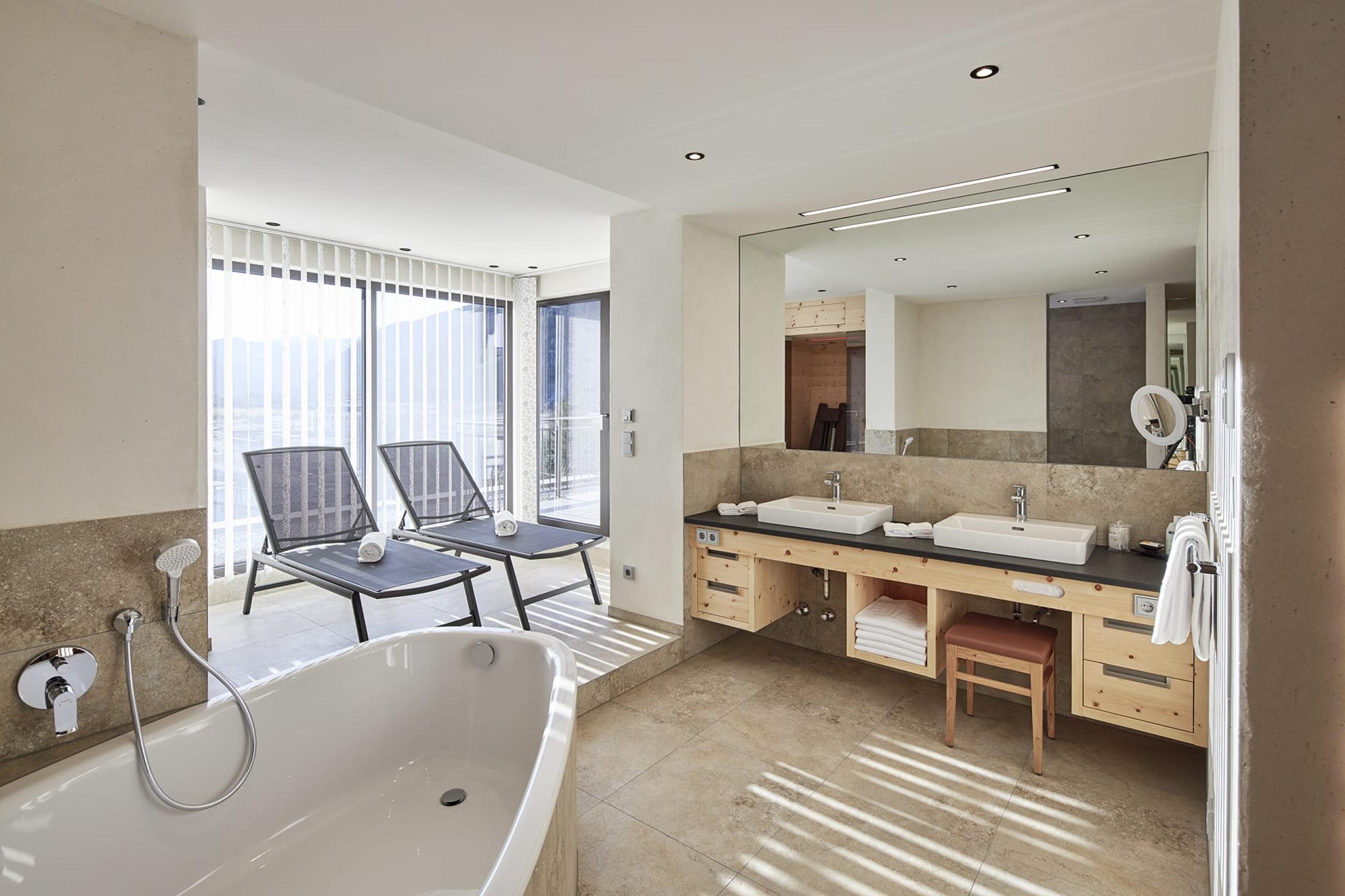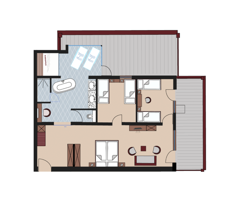 Other amenities: 1 master bedroom with living area and 2 children's rooms, each with 2 single beds (190 x 90), south-facing balcony with lake view and large terrace, oak flooring, refrigerator, shower and bathtub, children's washbasin, infrared cabin, hairdryer, cosmetic mirror, separate toilet, telephone, Wi-Fi, safe, 55'' smart TV with Netflix, Amazon TV, and Sky with soundbar.