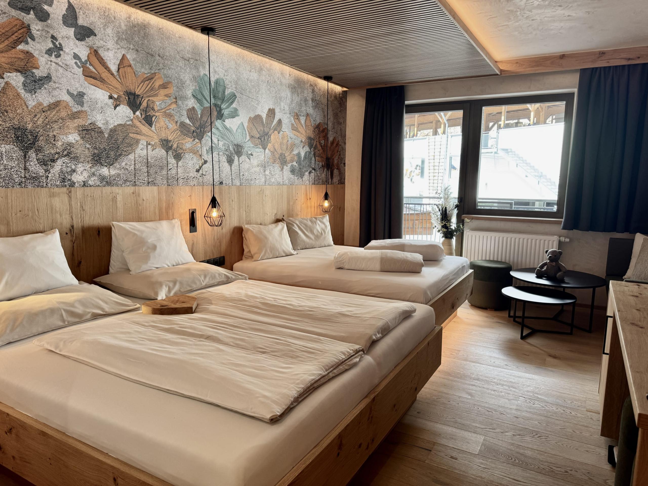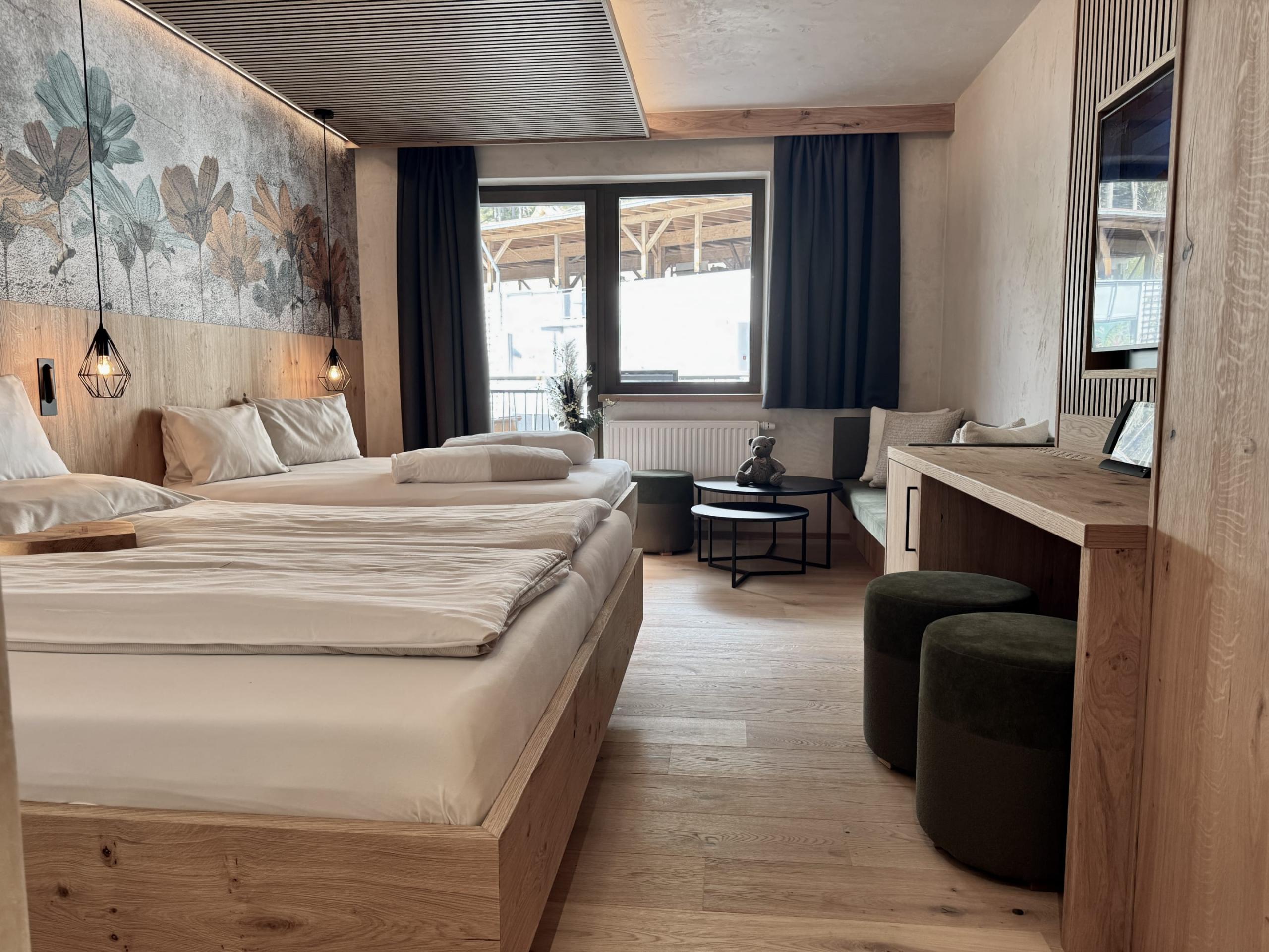 Doppelbett, Kinderdoppelbett (140 x 180 cm), Wohnecke, Balkon, Dusche oder Bad und WC, Föhn, Kosmetikspiegel, Safe, Flat-TV, Telefon, W-Lan, computergesteuerte Babyphone-Anlage